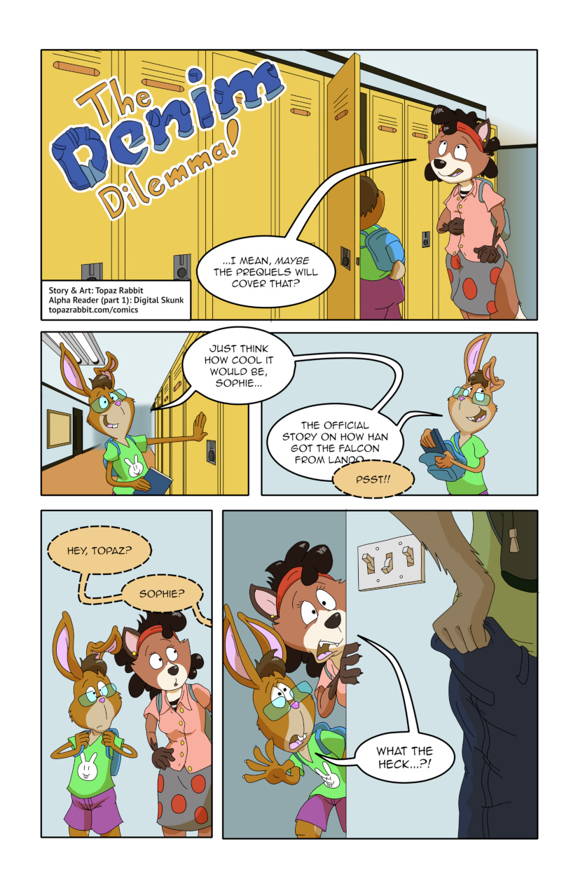 A school hallway lined with lockers. Sophie, a fox, is talking to Topaz, a rabbit.